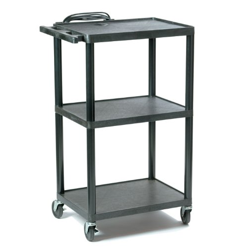 AV Cart. Made by Buhl.The Buhl polyethylene a/v cart is the most versatile in the market. Select your height 16", 26", 34" or 42" like having 4 carts in one. Includes 4" non-maring casters (2 locking), Integrated 15' UL/CSA power strip with 3 outlets. All shelves are 24"w x 18"d. Reinforced ribbing on the underside for extra strength and durability. Top shelf has a 1/2 lip surround and molded handle cord wrap and cabling conduit. Ready to assemble.