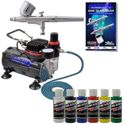 Master Airbrush® Brand Complete Airbrush System with Paint. G22 Airbrush, Air Compressor, 6' Air Hose, 2-oz Bottles of Createx Premium Artist Paint in Black, Red, Blue, Yellow, Green & White. The Kit Now Includes a (FREE) How to Airbrush Training Book to Get You Started, Published Exclusively By Master Airbrush.