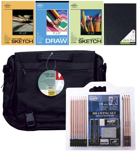 Pro Art "Art on the Go' drawing set. Included in this pack are: 8-1/2-inch by 11-inch hardbound sketch book, 9-inch by 12-inch heavyweight sketchbook, 9-inch by 12-inch drawing tablet, 9-inch by 12-inch travel sketch book, an eighteen-Piece sketch pencil set (includes eight graphite pencils, three charcoal pencils, one sketch stick, two charcoal stick, one pencil sharpener, one charcoal sharpener, one kneaded eraser and one white plastic eraser) all tucked into a 11-inch by 14-inch art supply bag with a big 2-3/4-inch gusset.