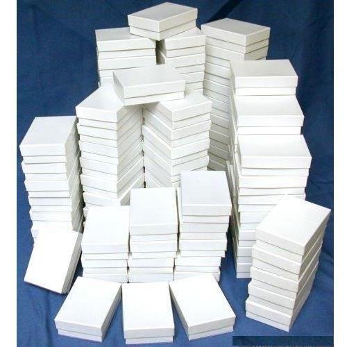 100 New Cotton Jewelry Gift Boxes For Displays, Showcases & Countertops. This is a new set of 100 cotton filled jewelry boxes. These white boxes are great for gift giving or store use. Each measures approximately 3 1/4" x 2 1/4" x 1" (82 x 57 x 25 mm).